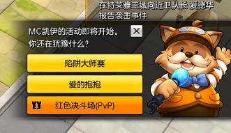 小游戏大致分成四类,今天要介绍的第一种就是每个小时的05分和35会在右下角提示你的MC凯伊的小游戏,这个MC凯伊小游戏每次会随机出现两种小游戏外加一个pvp对战入口。大约提示一分钟左右,错过了就要等下次啦!每次挑战成功之后,会获得索菲的祝福buff,每秒百分比回复生命值外加野怪经验加成,绝对是好东西!