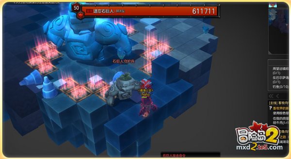 干掉了沿路上的喽啰们,我们会进入到地底洞穴二层,在这里我们会遇到副本BOSS遗忘石巨人。遗忘石巨人会召唤出2名跟班来协助自己一同攻击玩家,其本身也会蓄力后来猛击我们(伤害一般,且较容易躲避,威胁性不大)。