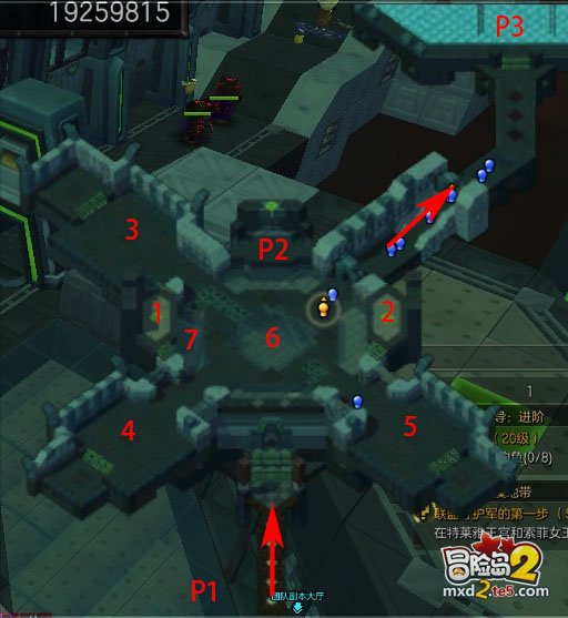 小怪会刷新在1、2两处的平台上,3、4、5的房间里,6、7是在地下,需要从两边楼梯处走下去清。除了这些地方,BOSS中间周围还会刷些暗影怪,也需要及时清理。