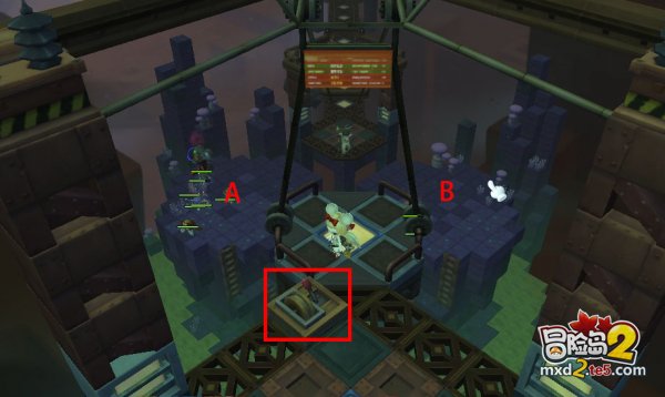 进入副本后,等待所有人上吊车后,开启红框内的机关,吊车会驶向AB两个平台。